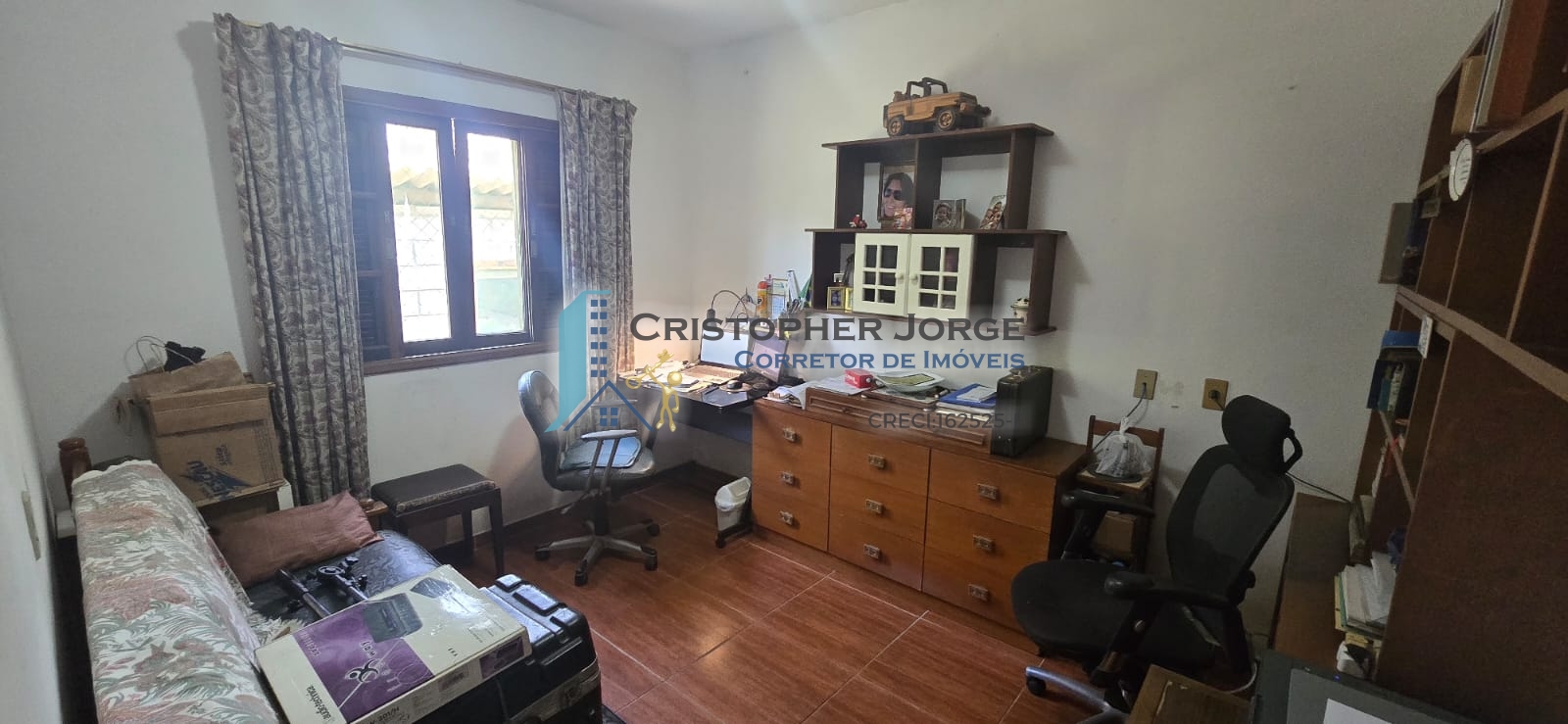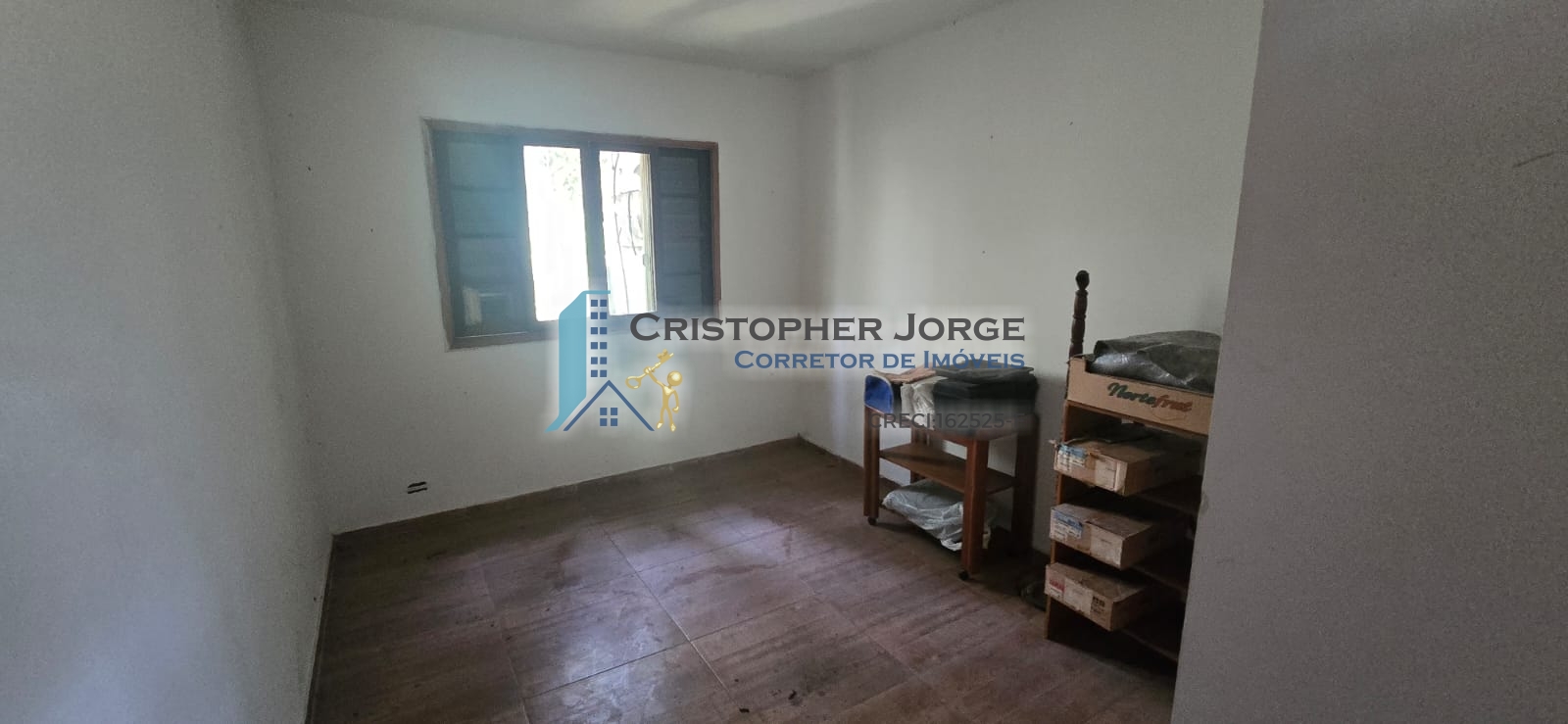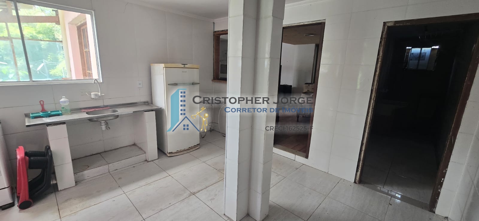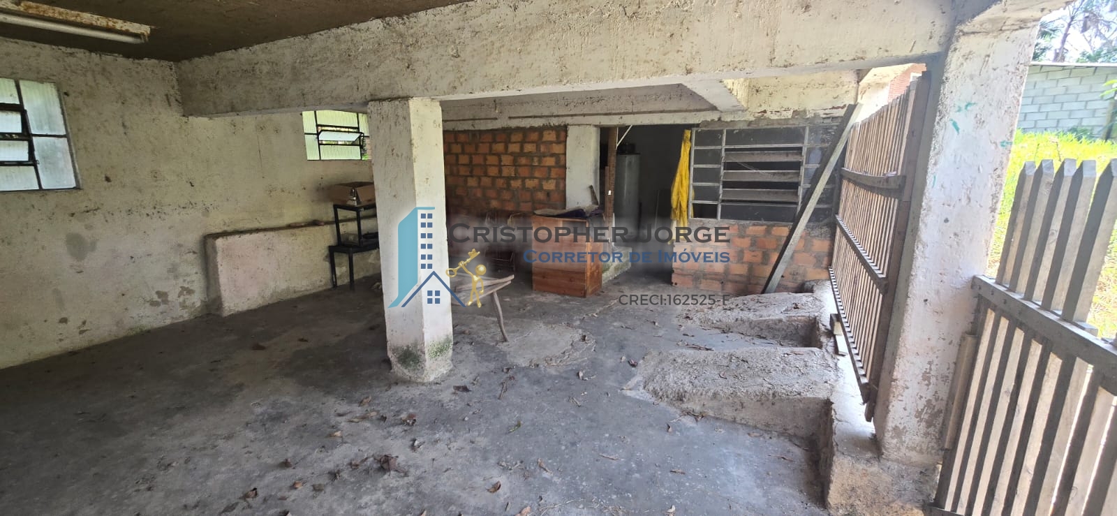- Uma casa com sala para dois ambientes, cozinha ampla, banheiro social, três dormitórios, um banheiro externo e lavanderia. Possui duas vagas de garagem cobertas e um depósito;